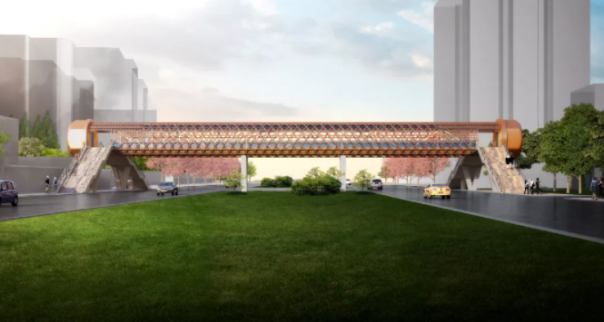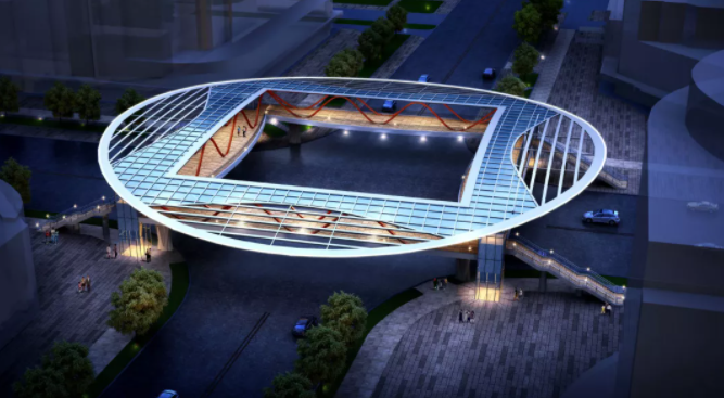 ? 渭城區(qū)政府門前人行天橋,位于渭城區(qū)政府門前,主橋跨度為18.5m,主橋?qū)挾葹?.5m。該橋在景觀設(shè)計(jì)時(shí)采用結(jié)構(gòu)主義手法, 通過(guò)兩對(duì)互相依靠的弧形反向相扣交錯(cuò)在一起形成穩(wěn)定三角形結(jié)構(gòu),靠向上弧的一對(duì)弧形支撐起了橋體的重量,向下弧的一對(duì)弧形成為了雨棚的骨架,結(jié)構(gòu)形式簡(jiǎn)潔有力但施工難度大、造價(jià)高。南南鋁技術(shù)團(tuán)隊(duì)大膽創(chuàng)新、小心求證、科學(xué)設(shè)計(jì)、重構(gòu)了橋梁結(jié)構(gòu)體系,并巧妙修改了傳力體系,從而將弧形支撐結(jié)構(gòu)變?yōu)檠b飾體系,不僅大幅度降低了整座天橋的制造成本,還做到了整個(gè)體塊粗中有細(xì),展現(xiàn)結(jié)構(gòu)之美又不失柔和之處,這一設(shè)計(jì)為業(yè)主節(jié)約了近600萬(wàn)元成本,受到業(yè)主的充分肯定。該項(xiàng)目目前已完成初步設(shè)計(jì),正進(jìn)行施工圖繪制,不久將亮相咸陽(yáng)。